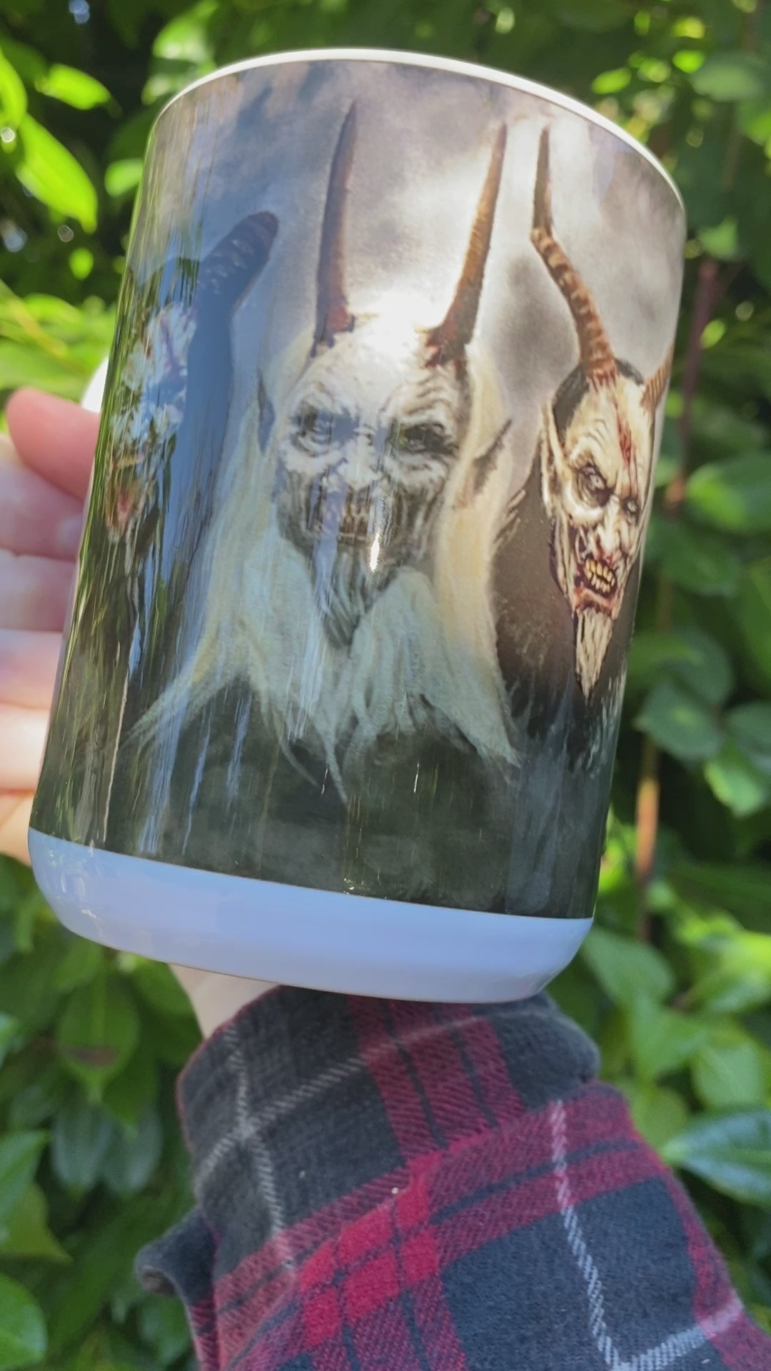 Embrace the spirit of the season with a twist of folklore and fright! This 15 oz ceramic mug features MKO of Monsters and Monsteras' artwork inspired by the eerie masks of Krampus Seattle. Based on an original acrylic painting, this design captures the darkly festive charm of the Krampus tradition, adding an edge to your holiday sipping experience. Made to order, this mug is perfect for coffee, cocoa, or tea lovers who appreciate a dash of the unconventional. Bring some winter mystery to your collection with this unique homage to the season’s spookier side!